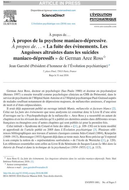 GARRABÉ, Jean, « À propos de la psychose maniaco-dépressive. À propos de « La Fuite des événements. Les Angoisses altruistes dans les suicides maniaco-dépressifs » de German Arce Ross », L’Évolution psychiatrique, Vol. 82, n° 1, 2017, pp. 248-251